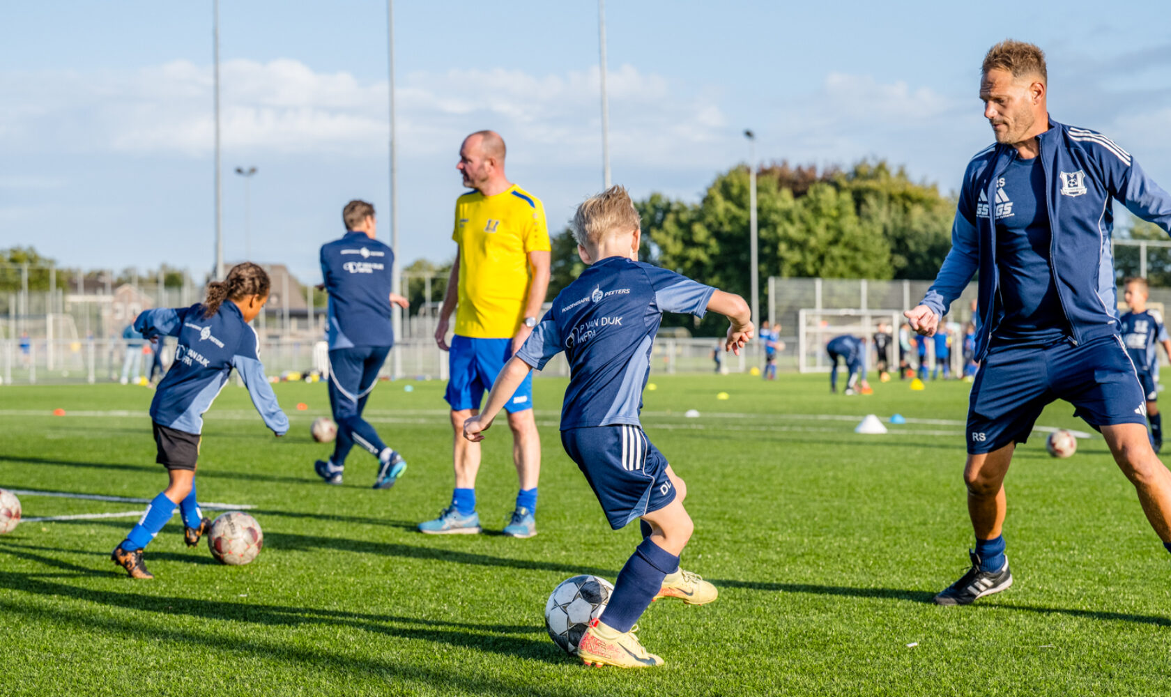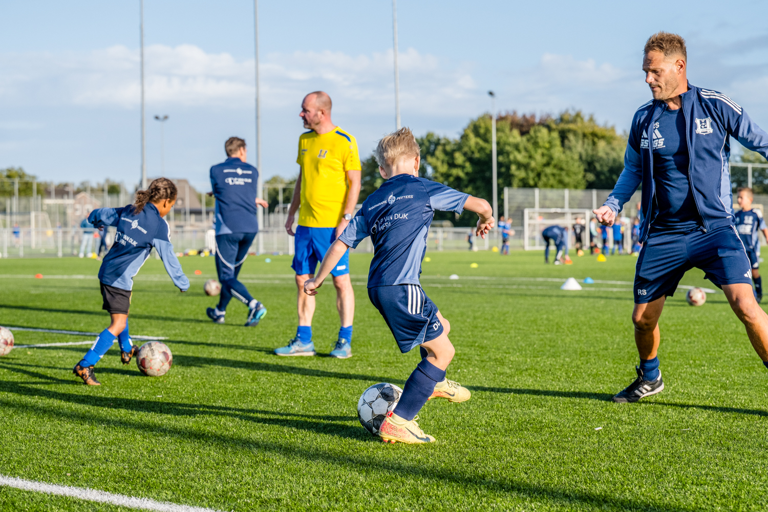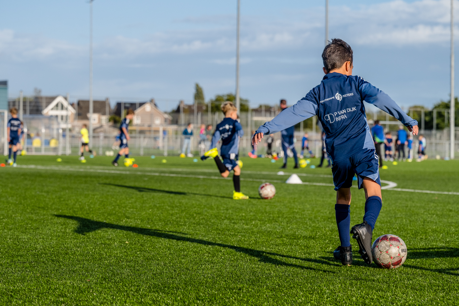 “Nu gaan we even in twee groepen verder. De ene groep werkt af op doel, waarbij ik ze leer om voor het schot te trippelen op de tenen. Waarom? Dan staan ze even stil en kunnen ze beter trappen. De andere groep speelt kleine partijtjes. Eén tegen één en twee tegen twee, zodat de intensiteit hoog is en spelers veel de bal hebben. Ze moeten dan zelf oplossingen bedenken: dribbelen, schijnbewegingen maken of afspelen. Ook komen ze vaak in duel.”